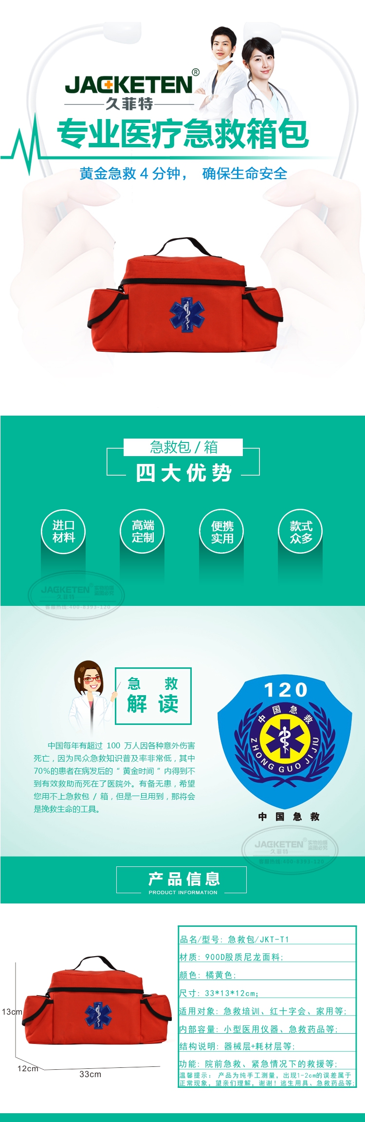 品名/貨號:急救包/JKT-T1;材質(zhì):900D股質(zhì)尼龍面料;顏色:橘黃色;尺寸:33*13*12cm;適用對象:急救培訓(xùn)、紅十字會、家用等;內(nèi)部容量:小型醫(yī)用儀器、急救藥品等;結(jié)構(gòu)說明:器械層+耗材層;功能:院前急救、緊急情況下的救援等