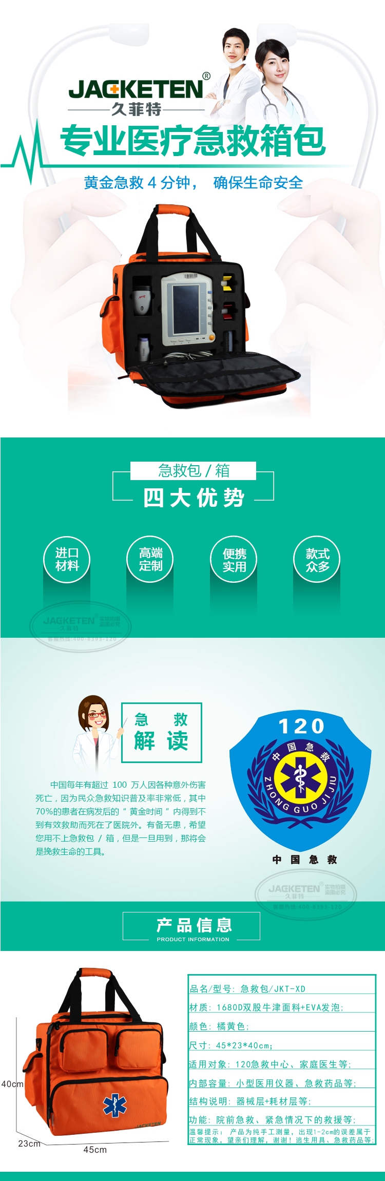 品名/貨號:急救包/JKT-XD;材質(zhì):1680D雙股牛津面料+EVA發(fā)泡;顏色:橘黃色;尺寸:45*23*40cm;適用對象:120急救中心、家庭醫(yī)生等;內(nèi)部容量:小型醫(yī)用儀器、急救藥品等;結(jié)構(gòu)說明:器械層+耗材層;功能:院前急救、緊急情況下的救援等